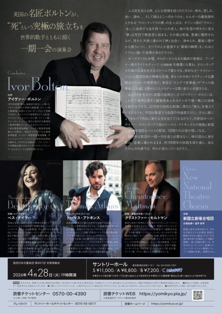 ALL 4/28読響『ゲロンティアスの夢』出演 読売日本交響楽団第657回定期演奏会エルガー作曲オラトリオ『ゲロンティアスの夢』に新国立劇場合唱団として出演いたします。 詳細はこちら https://yomikyo.or.jp/concert/2026/01/657-1.php