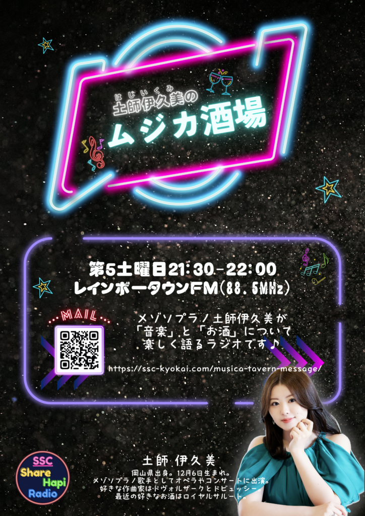 ALL MEDIA NEWS VOICE レインボータウンFM「土師伊久美のムジカ酒場」放送決定! 新年度より、レインボータウンFMさんで新番組「土師伊久美のムジカ酒場」の放送が決定しました! 冠番組がなんと2つに✨ 放送日は第5土曜日21:30-22:00で、初回放送は《5月30日》です! お便りも募集しております↓ 『土師伊久美のムジカ酒場』番組へ感想や応援メッセージフォーム